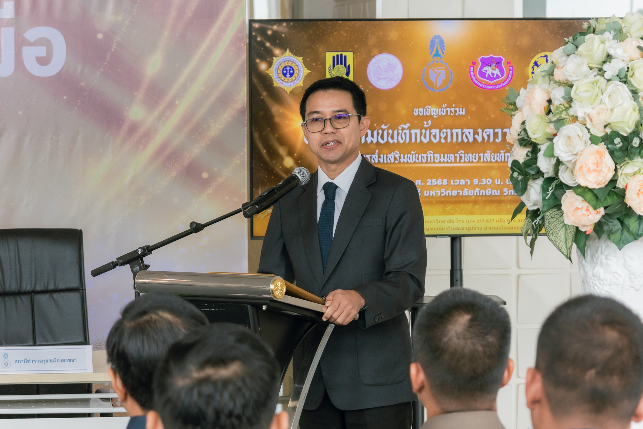 เมื่อวันที่ 9 กันยายน 2568 รองศาสตราจารย์ ดร.ณฐพงศ์ จิตรนิรัตน์ อธิการบดีมหาวิทยาลัยทักษิณ เป็นประธาน พร้อมทั้งปาฐกถาเกี่ยวกับบทบาทและเป้าหมายมหาวิทยาลัยทักษิณ ต่อการขับเคลื่อน สนับสนุน ความร่วมมือกับภาคส่วนต่าง ๆ ในจังหวัดสงขลา และได้ร่วมลงนามบันทึกข้อตกลงความร่วมมือ (MOU) กับหน่วยงานภาครัฐและท้องถิ่นจังหวัดสงขลา จำนวน 6 หน่วยงานได้แก่ สำนักงานป้องกันและบรรเทาสาธารณภัยจังหวัดสงขลา, สำนักงานป้องกันและปราบปรามยาเสพติด ภาค 9, กองกำกับการตำรวจตระเวนชายแดนที่ 43, ที่ว่าการอำเภอเมืองสงขลา, สถานีตำรวจภูธรเมืองสงขลา และสำนักงานขนส่งจังหวัดสงขลา เพื่อเสริมสร้างความร่วมมือในการดำเนินงานตามพันธกิจของมหาวิทยาลัยทักษิณ อันประกอบด้วยการพัฒนาการศึกษา การสร้างความมั่นคงและความปลอดภัย การป้องกันและแก้ไขปัญหายาเสพติด รวมถึงการพัฒนาคุณภาพชีวิตและสังคมท้องถิ่น