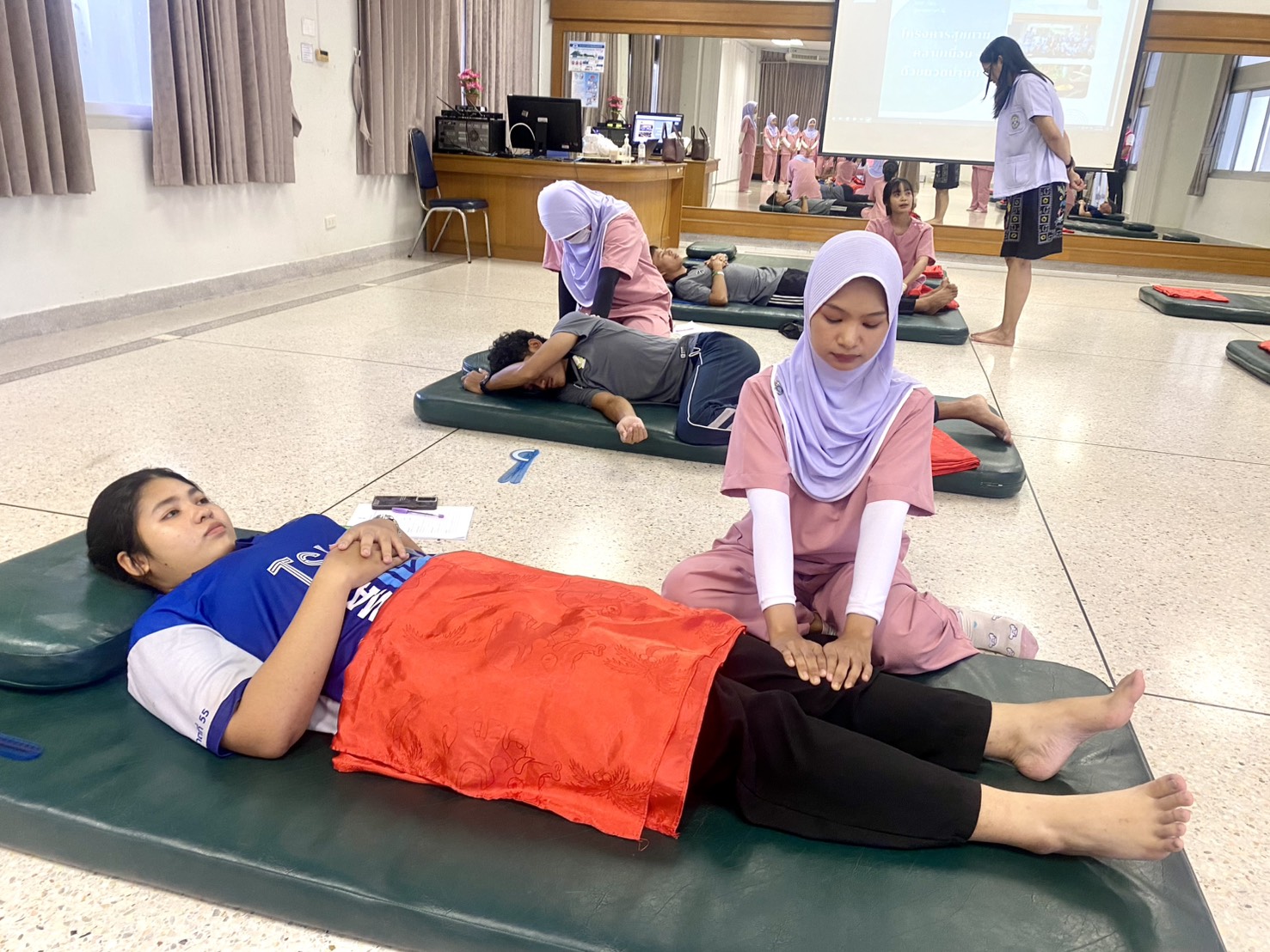 นิสิตหลักสูตรการแพทย์แผนไทยบัณฑิต คณะวิทยาการสุขภาพและการกีฬา มหาวิทยาลัยทักษิณ วิทยาเขตพัทลุง ฝึกทักษะวิชาชีพ จัดการบริการนวดรักษาฟรีแก่บุคลากร และประชาชนทั่วไปที่มีอาการทางระบบกล้ามเนื้อ ภายใต้การดูแลของคณาจารย์ผู้เชี่ยวชาญ สร้างทั้งประโยชน์ต่อสังคมและประสบการณ์ตรงก่อนออกสู่การทำงานจริง