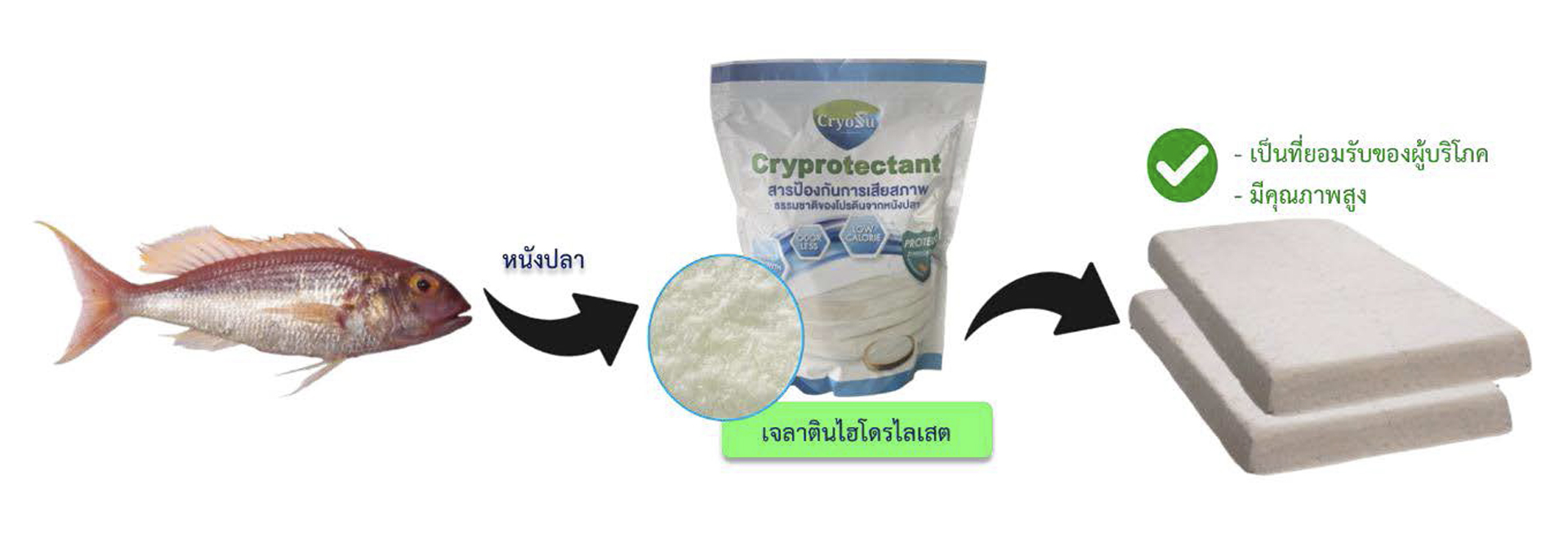 งานวิจัยนี้ไม่เพียงแต่เพิ่มมูลค่าให้กับเศษเหลือทิ้งจากกระบวนการแปรรูปสัตว์น้ำแต่ยังช่วยลดขยะและผลกระทบต่อสิ่งแวดล้อม อีกทั้งยังสามารถนำเทคโนโลยีนี้ไปใช้ในอุตสาหกรรมอื่น เช่น การทดแทนสารประกอบฟอสเฟตในอุตสาหกรรมกุ้งแช่เยือกแข็ง ซึ่งเป็นแนวทางที่เป็นมิตรต่อสิ่งแวดล้อมและสร้างรายได้ให้กับผู้ประกอบการ ด้วยประสิทธิภาพสูงและความปลอดภัยของเจลาตินไฮโดรไลเสตจากหนังปลาที่สามารถใช้ในระดับความเข้มข้นต่ำกว่าของสารป้องกันการสูญเสียสภาพธรรมชาติทางการค้า และไม่มีรสหวานหรือสีคล้ำในระหว่างการเก็บรักษา งานวิจัยนี้จึงเป็นก้าวสำคัญที่ช่วยพัฒนานวัตกรรมในอุตสาหกรรมอาหารและผลิตภัณฑ์จากสัตว์น้ำ ให้มีความยั่งยืน ปลอดภัย และตอบโจทย์ความต้องการของตลาดอย่างแท้จริง