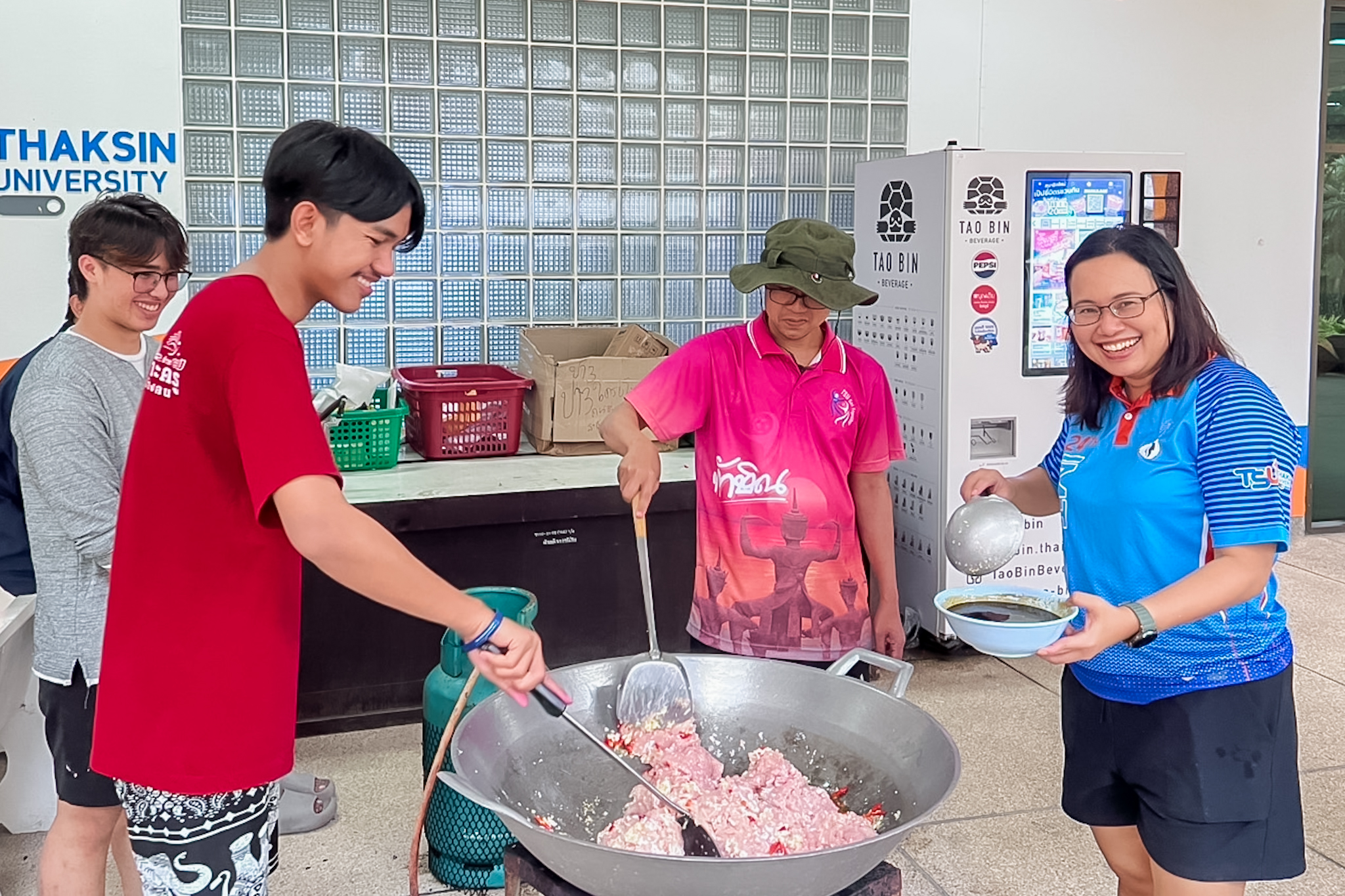 ทางด้านของวิทยาเขตพัทลุง สำหรับมื้อกลางวันยังพิเศษยิ่งขึ้น เมื่อรองศาสตราจารย์ ดร.ณฐพงศ์ จิตรนิรัตน์ อธิการบดีมหาวิทยาลัยทักษิณ ลงมือปรุงอาหารด้วยตนเองเคียงข้างรองศาสตราจารย์ ดร.สมัคร แก้วสุกแสง รองอธิการบดีฝ่ายวิจัยและนวัตกรรม พร้อมด้วยบุคลากรและนิสิตจิตอาสา ที่ร่วมแรงร่วมใจกันสร้างมื้ออุ่นใจให้กับน้อง ๆ นิสิตท่ามกลางสายฝนที่โปรยปรายตลอดทั้งวัน กับเมนูข้าวไข่เจียว มาม่าต้ม–ผัด ต่อด้วยเมนูมื้อเย็นอย่างหมี่ผัดซีอิ๊ว พร้อมไข่ไก่อารมณ์ดีต้มสุกกว่า 1,700 ฟอง จากฟาร์ม “ชัยบุรีโมเดล ไข่ไก่อารมณ์ดี–แฮปปี้ฟาร์ม” ภายใต้โครงการวิจัยและนวัตกรรมแก้ไขปัญหาความยากจนแบบเบ็ดเสร็จและแม่นยำ จังหวัดพัทลุง เพื่อให้ทุกคนอิ่มท้อง อุ่นใจ และไม่ต้องกังวลเรื่องค่าใช้จ่ายหรือการเดินทางออกไปซื้ออาหารในช่วงสภาพอากาศไม่เอื้ออำนวย