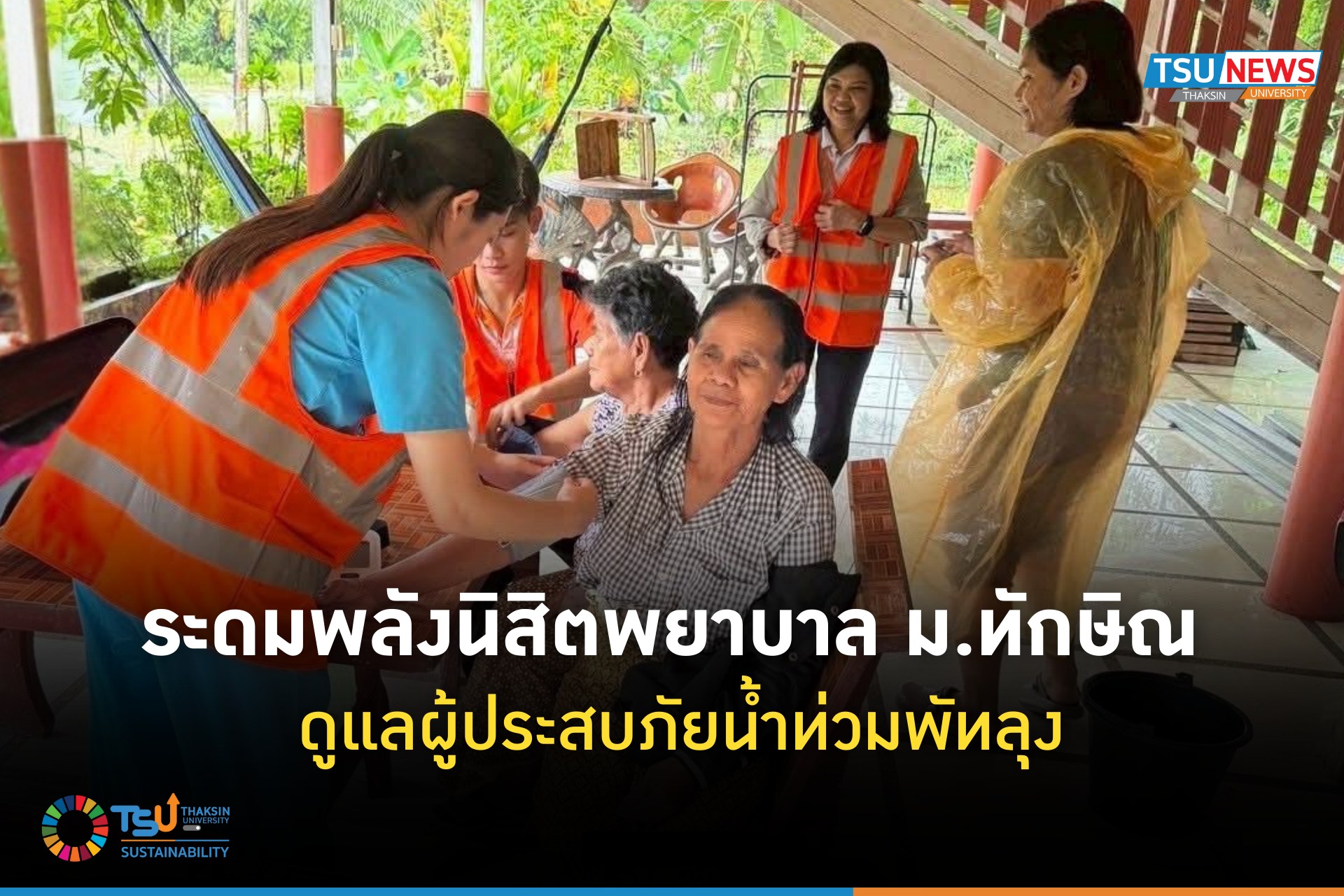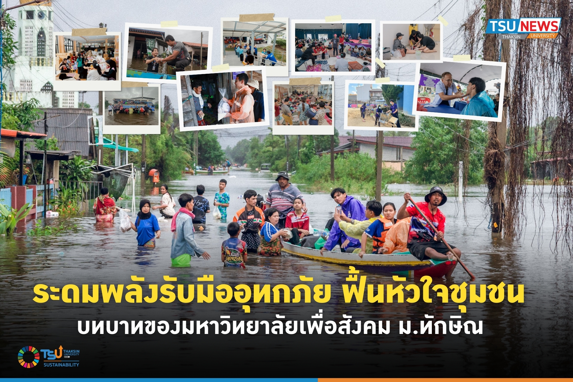 เราจัดตั้ง “ศูนย์ปันน้ำใจ” ทั้งที่วิทยาเขตสงขลา และวิทยาเขตพัทลุง เปิดรับบริจาค มีบุคลากร นิสิต และเครือข่ายจิตอาสาออกช่วยเหลือ แจกจ่ายถุงยังชีพ อาหาร น้ำดื่มแก่ประชาชนในพื้นที่ จัดตั้งศูนย์พักพิงผู้ประสบภัย (TSU Shelters) ที่วิทยาเขตสงขลา, สถาบันทักษิณคดีศึกษา, ที่วิทยาเขตพัทลุง - คณะพยาบาลศาสตร์ จัดหน่วยแพทย์อาสาและพยาบาลเคลื่อนที่เร็วช่วยเหลือกลุ่มเปราะบาง ผู้สูงอายุ และเด็ก จัดตั้งครัวกลาง ผลิตอาหารและอุปกรณ์ยังชีพพื้นฐานที่จำเป็น การเผยแพร่ความรู้และความเคลื่อนไหวเพื่อสร้างการมีส่วนร่วมในการแก้ไขปัญหา ทั้งระหว่างประสบภัยและการฟื้นฟูหลังน้ำลด การช่วยเหลือสนับสนุนผู้ประสบภัยด้านอื่นๆ เช่น พื้นที่จอดรถ พื้นที่พักคอย บริการน้ำ ไฟฟ้า เป็นต้น