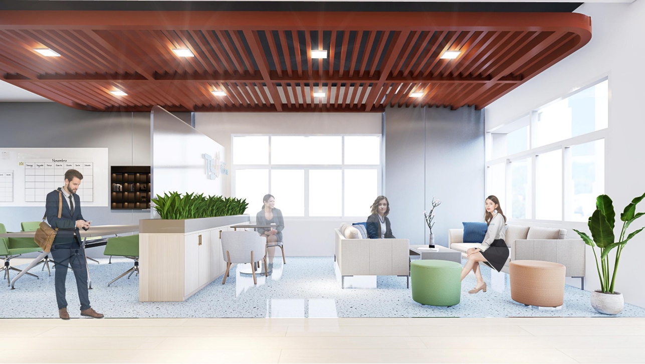 -  ครัวกลาง ห้องรับแขก และพื้นที่นั่งเล่น