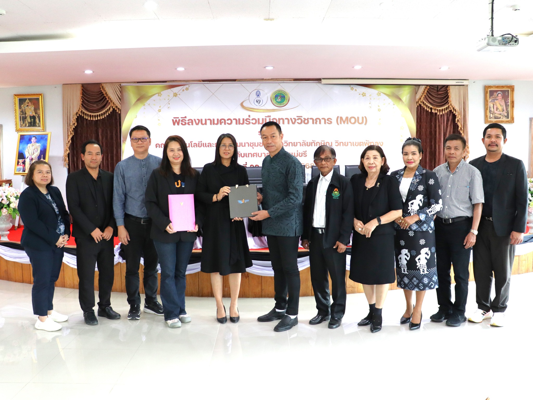 พิธีลงนามบันทึกความเข้าใจความร่วมมือทางวิชาการ โครงการ “เพิ่มสุขอยู่ที่บ้าน (Happiness @Home)” เพื่อส่งเสริมและพัฒนาทักษะอาชีพของผู้สูงอายุ ผ่านกิจกรรมเกษตรเพื่อสุขภาพ การบริการวิชาการ และการสร้างแหล่งเรียนรู้ต้นแบบ ภายใต้แนวคิด TSU Community Hub โดยมุ่งยกระดับคุณภาพชีวิต สร้างรายได้ และขับเคลื่อนเศรษฐกิจฐานรากอย่างยั่งยืน พร้อมทั้งบูรณาการการเรียนการสอน การวิจัย และนวัตกรรมของมหาวิทยาลัยให้ตอบโจทย์การพัฒนาชุมชนอย่างเป็นรูปธรรม โครงการดังกล่าวจัดขึ้น ณ เทศบาลตำบลแม่ขรี อำเภอตะโหมด จังหวัดพัทลุง โดยมีผู้บริหาร บุคลากร นิสิต และภาคีเครือข่ายในพื้นที่เข้าร่วมกิจกรรมอย่างพร้อมเพรียง