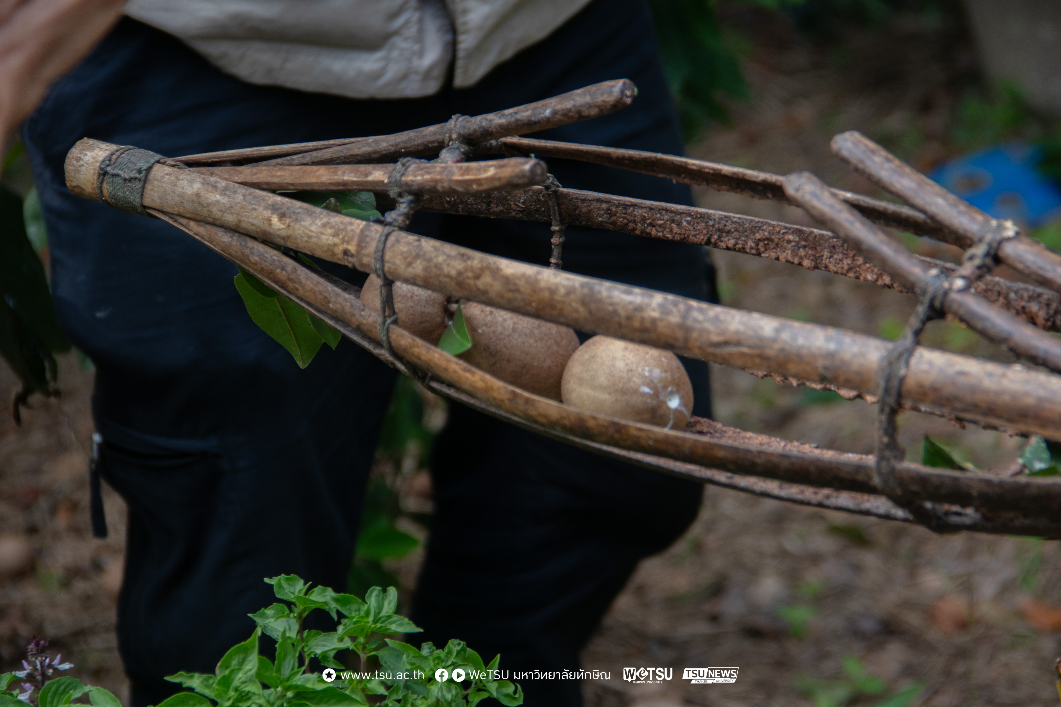 ถัดจากร้านมันเดือยไม่มาก ขณะทัวร์ของเราก็เดินมาหยุดอยู่ที่ซุ้มเล็ก ๆ ของบ้านหลังหนึ่ง กระปุกกะปิและสวาในถุงพร้อมขายตั้งเรียงรายรอคนมาจับจอง พ่อค้าเจ้าของบ้านใจดีให้เราชิมสวา พร้อมสาธิตวิธีการเก็บผลจากต้นด้วยตะกร้อเก็บผลไม้รูปทรงไม่คุ้นตา นอกจากสนุกแล้วยังอิ่มไปตามๆ กัน